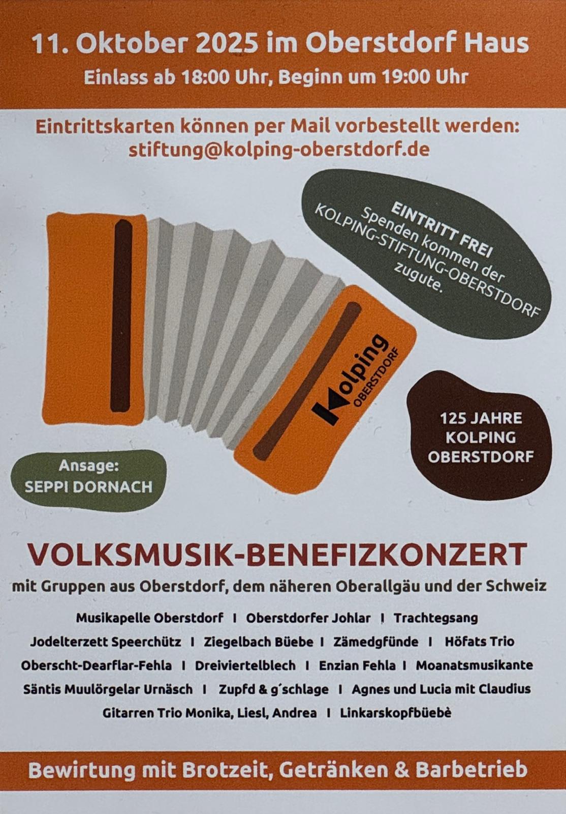 mit Gruppen aus Oberstdorf, dem näheren Oberallgäu und der Schweiz. Eintritt frei - Spenden kommen der neu gegründeten Kolping-Stiftung-Oberstdorf zugute! Bewirtung mit Brotzeit, Getränken und Barbetrieb. Eintrittskarten können per Mail vorbestellt werden: stiftung@kolping-oberstdorf.de Einlass ab 18.00h - Beginn um 19.00h - Restkarten gibt es an der Abendkasse